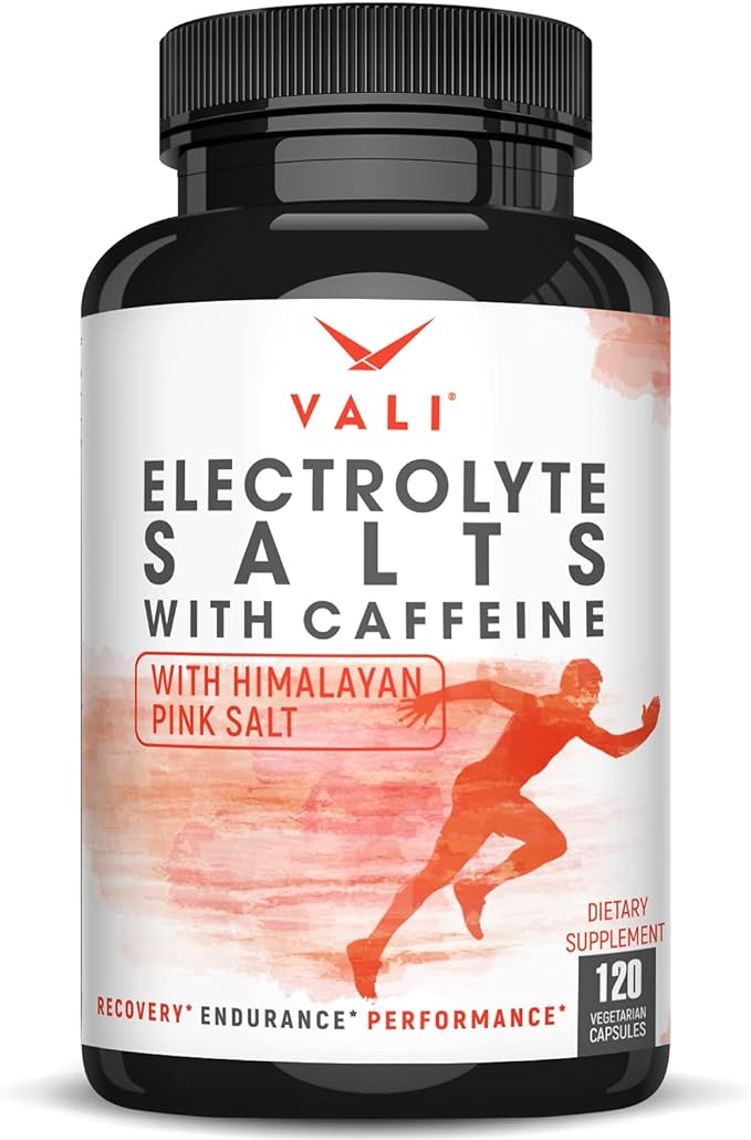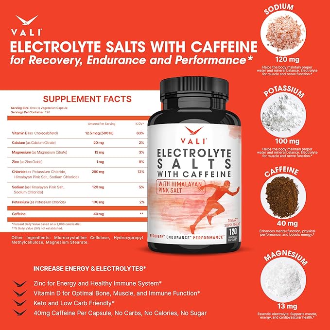 VALI Electrolyte Salts Plus 40mg Caffeine. Rapid Oral Rehydration Replacement Pills. Hydration Nutrition Powder Supplement, Energy, Recovery & Relief Fast. Fluid Health Essentials. 120 Veggie Capsules