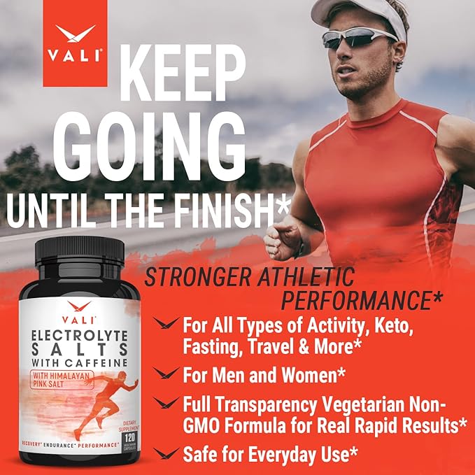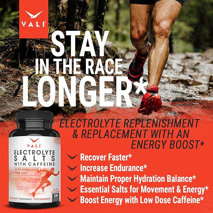 - Fast Acting & Easy Quick Hydration - Electrolytes are essential for muscle movement and energy. When you exercise, run, play sports, or go low carb keto, your body gets rid of critical salts through sweat and perspiration. If not replaced, muscles cramp, get tired, and tighten up. Use a salt mixture you can take to replenish on-the-go. No drinks, packs, packets, sticks, or mixing tablets. Bring VALI salt pills with caffeine to the race event, hike, or take at home to stay hydrated with no mess.