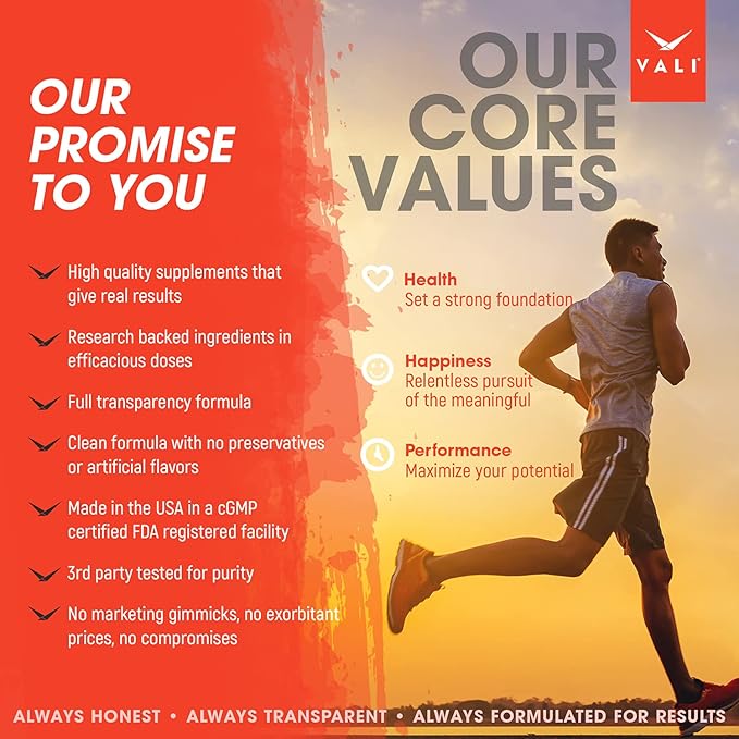 - Health, Happiness, & Performance - We started VALI because we want to know exactly what’s inside our supplements and we want supplements that give real results without the marketing fluff other companies use to charge exorbitant prices. Nothing proprietary, clean highest quality ingredients at a great value, transparent formula, 3rd party testing for purity, and a commitment to above and beyond customer service. This is our promise to you!