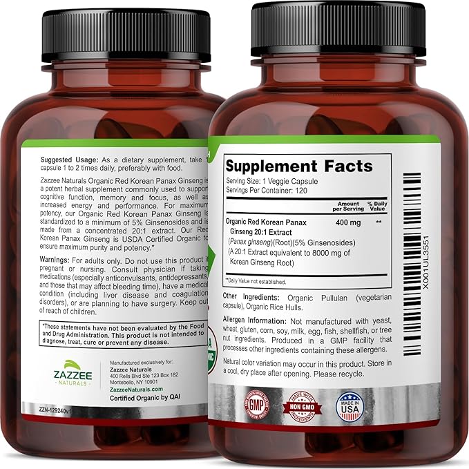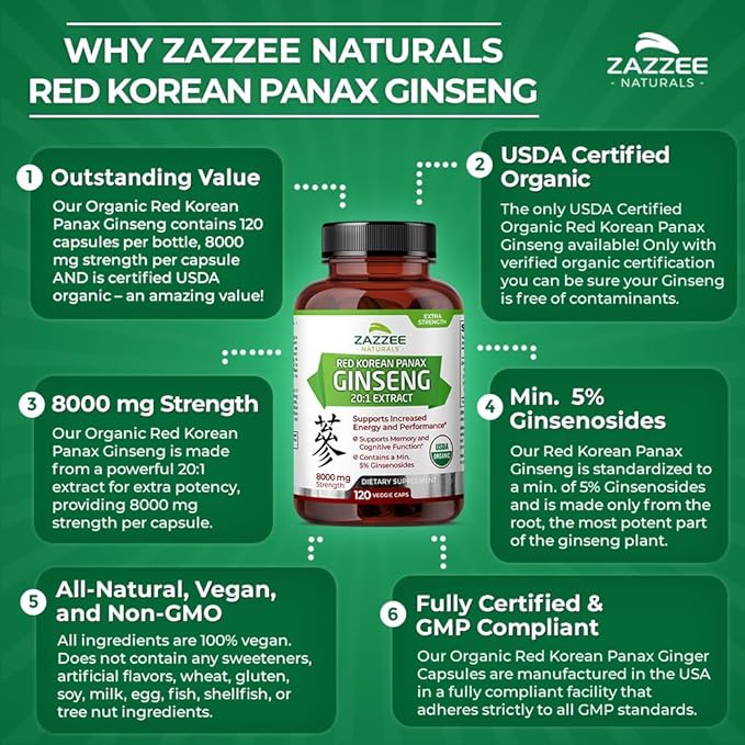 - USDA CERTIFIED ORGANIC: Any Red Korean Panax Ginseng that is not CERTIFIED organic can be contaminated and toxic to your body. With Zazzee Naturals USDA Certified Organic Red Korean Panax Ginseng, you can be sure your Ginseng is organic, all-natural, vegan, and non-GMO. More, while other competing products use various chemicals as fillers, binders, and excipients, our Organic Red Korean Panax Ginseng instead contains only all-natural, organic stabilizers.