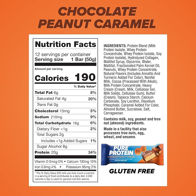 - NEW LOOK! One 12 count box of Pure Protein Chocolate Peanut Caramel Protein Bars