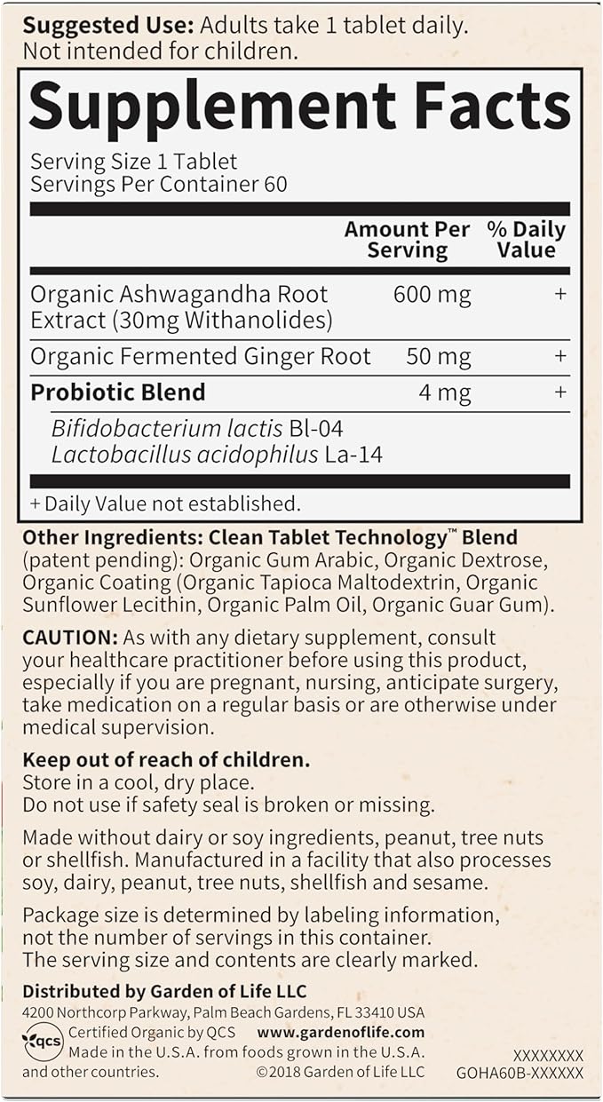 Garden of Life Organics Ashwagandha Stress, Mood & Energy Support Supplement with Probiotics & Ginger Root for Digestion - Vegan, Gluten Free, Non GMO – 2 Month Supply, 60 Tablets