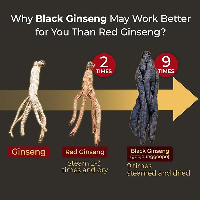 - Korean Black Ginseng Excellence: Created using the 'goojeunggoopo' method involving nine rounds of steaming and drying, this transformation from vibrant red to deep black results in heightened ginsenoside content, the heart of its potency.