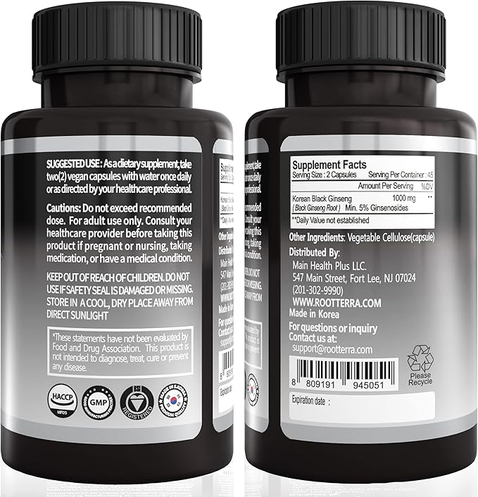 Korean Black Panax Ginseng Capsule 1000mg - 90 Vegan Capsules Non GMO, High Ginsenosides, High Absorption Rate, Enhance Immunity, Mental Performance, Stamina & Energy, Men & Women