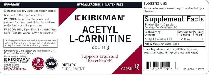 Kirkman - Acetyl L-Carnitine 250 mg - 90 Capsules - Supports Sustained Cellular Energy Production - Hypoallergenic