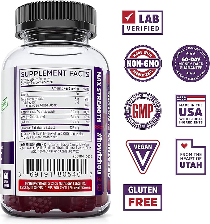 Zhou Nutrition Elder-Mune Sambucus Elderberry Gummies with Zinc and Vitamin C for Kids & Adults (Age 4+) Immune Support with Antioxidants, Vegan, Gluten Free, Non-GMO, 30 Servings, 60 Gummies