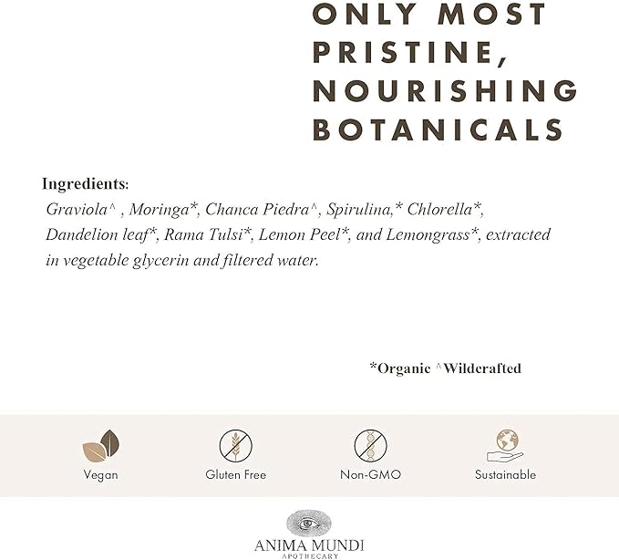 - Contains Graviola, Moringa, Chanca Piedra, Spirulina, Chlorella, Dandelion leaf, Rama Tulsi, Lemon Peel, and Lemongrass.
