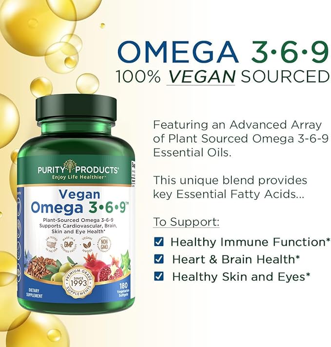 Purity Products Omega 3-6-9 Vegan Omega Formula - “5 in 1” Essential Fatty Acid Complex - Scientifically Formulated Plant-Based Omega 3 6 9 Essential Fatty Acids (EFA) - 3 Month Supply - 180 Softgels