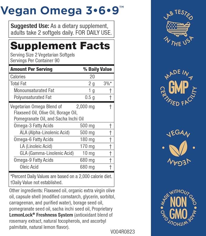 - 100% VEGAN OMEGA FATTY ACIDS – 500 mg of Omega-3, 180 mg of Omega-6, and 680 mg of Omega-9 from non-GMO plant and seed sources.