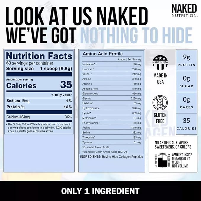 - HEALTH BENEFITS: Our diets today contain less collagen and starting about age 30 your body also begins producing less. Naked Collagen helps promotes joint health, acts as an anti-inflammatory, helps repair a leaky gut - a leading cause of autoimmune diseases and protects cartilage and bones. Additional benefits include: youthful skin, healthy hair, stronger nails and workout recovery.