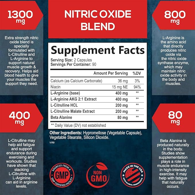 - Extra Strength Nitric Oxide Formula: Our premium nitric oxide supplement stack combines potent ingredients like L-Arginine, L-Arginine AKG 2:1, L-Citrulline, Malate, and Beta Alanine to deliver intense muscle pumps and maximize your workout performance