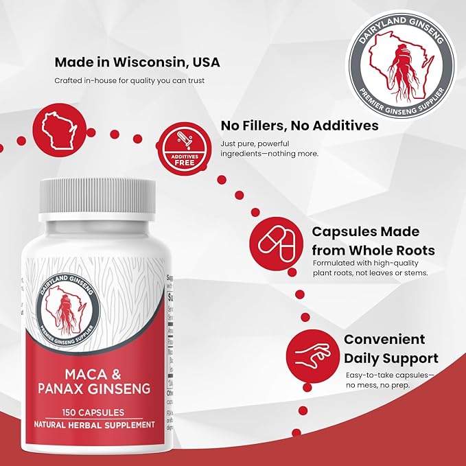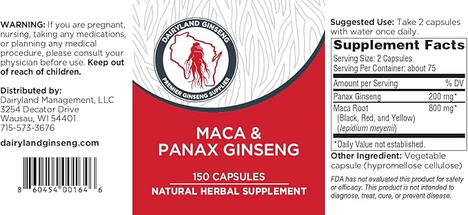 - SUPER BLEND: Dairyland Management's Premium Panax Red Ginseng with a unique blend of Red, Black, and Yellow Maca varieties gives a potent 1000 mg per serving