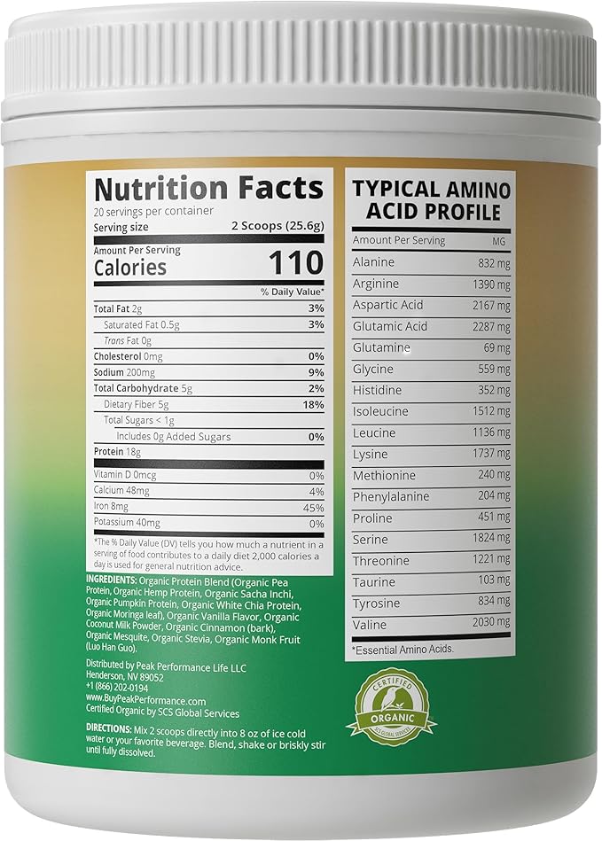 - Not All Plant Proteins Are Created Equal - Many plant protein supplements on the market are rice based or heavy on grains and just altogether insufficient in their amino acid profile to build lean muscle. Until now. With Peak Performance Complete Organic Plant Protein you can get a diverse blend of plant protein amino acids that are rich in antioxidants, fibers and omega 3’s to promote muscle building + lean muscle tissue and help maintain a healthy immune system.