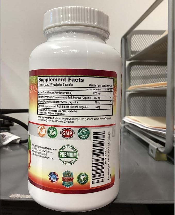- We take purity seriously: Fresh Healthcare's Apple Cider Vinegar was professionally formulated and tested in the USA to bring you the purest form of Natural Cinnamon, Ginger, and Cayenne Pepper as a whole. Our supplement is GMO Free and suitable for both Vegetarians and Vegans containing zero animal products. Let us help you support healthy metabolism, digestion, energy and weight control when you choose Fresh Healthcare Apple Cider Vinegar Pills.*