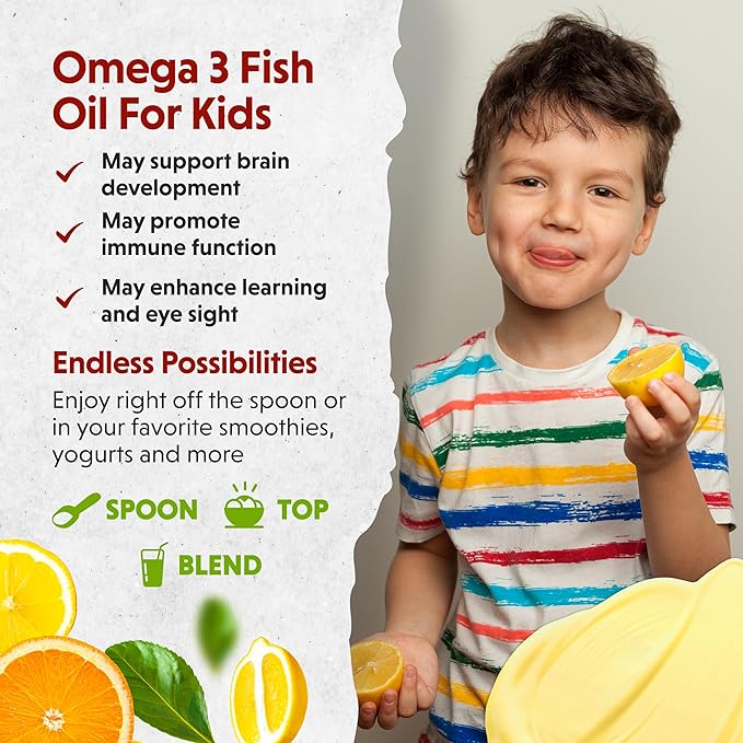 - OMEGA 3 FISH OIL FOR KIDS: Omega 3s are a friend to growing bodies and brains. Omega 3 fatty acid supplements for kids support brain development, immune system health, and may help with behavioral issues. With a whopping 540 mg of Omega 3 EPA and DHA, and the creamy taste and texture of a fruit smoothie, this fish oil is seriously nutritious and totally delicious