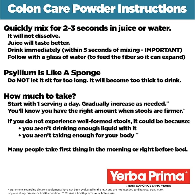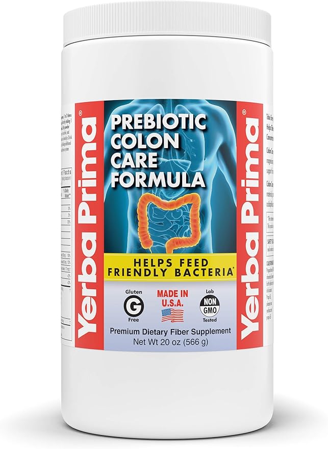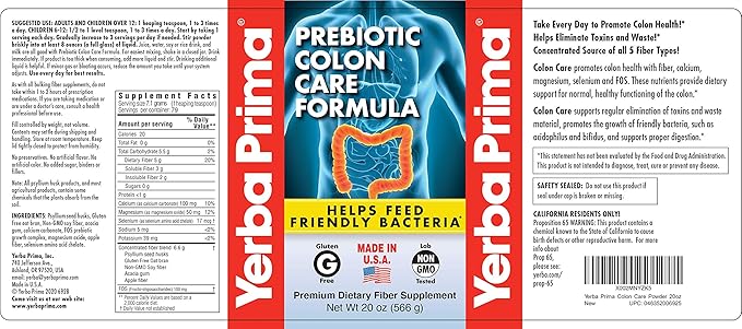 Yerba Prima Prebiotic Colon Care Formula, 20 oz Powder with FOS - Natural Psyllium Fiber, Magnesium, Selenium - Non-GMO, Gluten Free, Vegan Daily Supplement - for Men & Women