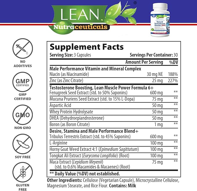 - WORKOUT SUPPLEMENT: Gain lean muscle with natural ingredients Horny Goat Weed for men, Tongkat Ali, Tribulus Terrestris, L-arginine, Fenugreek, Mucuna Pruriens, Maca Root, DHEA, Boron, D Aspartic Acid, Zinc, Niacin, Whey Protein Powder