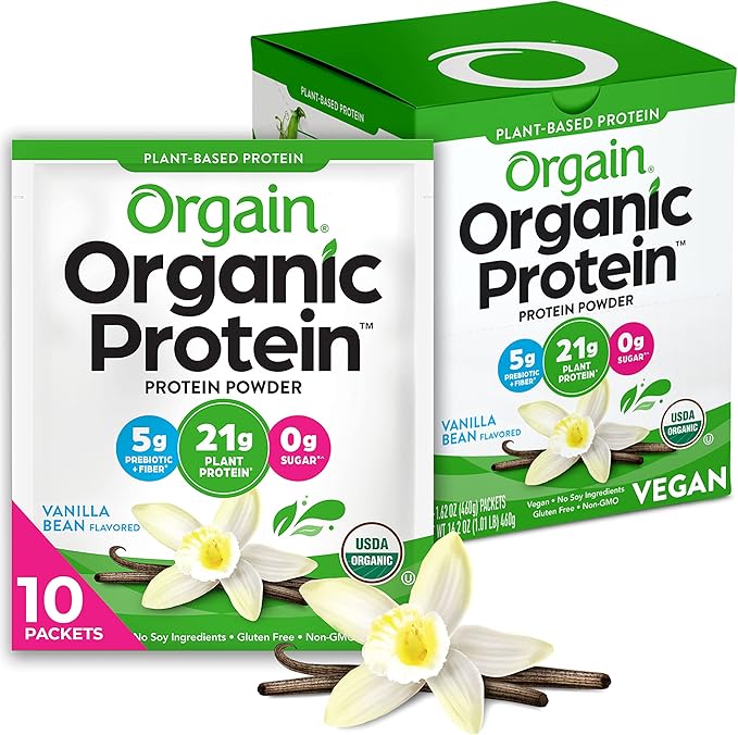 Orgain Organic Vegan Protein Powder, Vanilla Bean - 21g Plant Protein, 5g Prebiotic Fiber, Low Carb, No Lactose Ingredients, No Added Sugar, Non-GMO, For Shakes & Smoothies, 10 Travel Packs