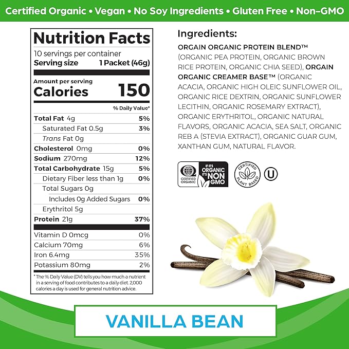 - WHAT TO EXPECT: Includes 10 Ready to Mix Single Use Travel Packet Serving Orgain Organic Vanilla Bean Protein Powder. Each packet contains 150 calories.