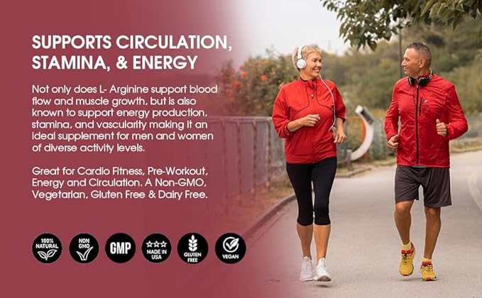 - SUPPORTS CIRCULATION, STAMINA, & ENERGY Not only does L- Arginine support blood flow and muscle growth, but is also known to support energy production, stamina, and vascularity making it an ideal supplement for men and women of diverse activity levels.