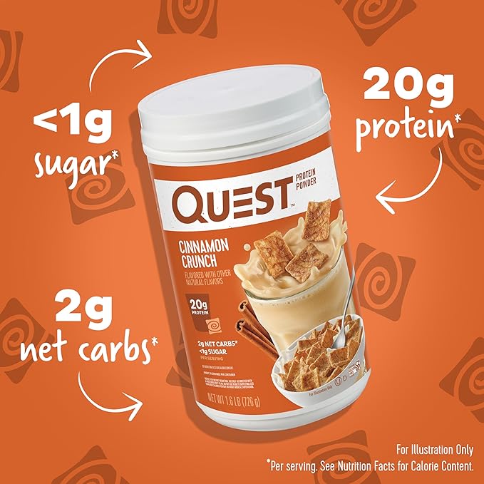 - SHAKE UP YOUR ROUTINE: Quest Cinnamon Crunch Protein Powder provides you with a delicious protein boost with 20g protein, 2g net carbs and less than 1g of sugar per scoop*.