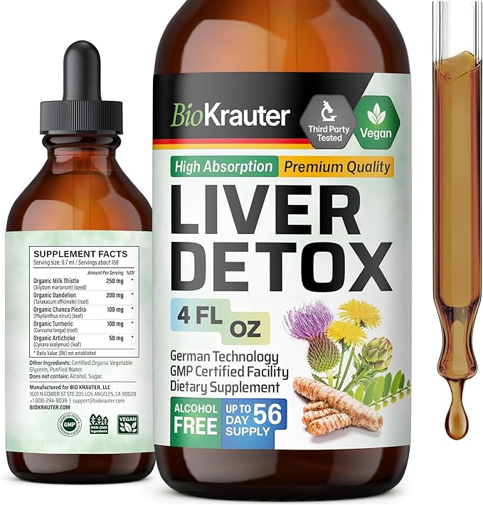 - Tincture for Liver Detox: BioKrauter liquid liver supplement, blend of milk thistle, chanca piedra, turmeric, dandelion, artichoke, supports liver detox.