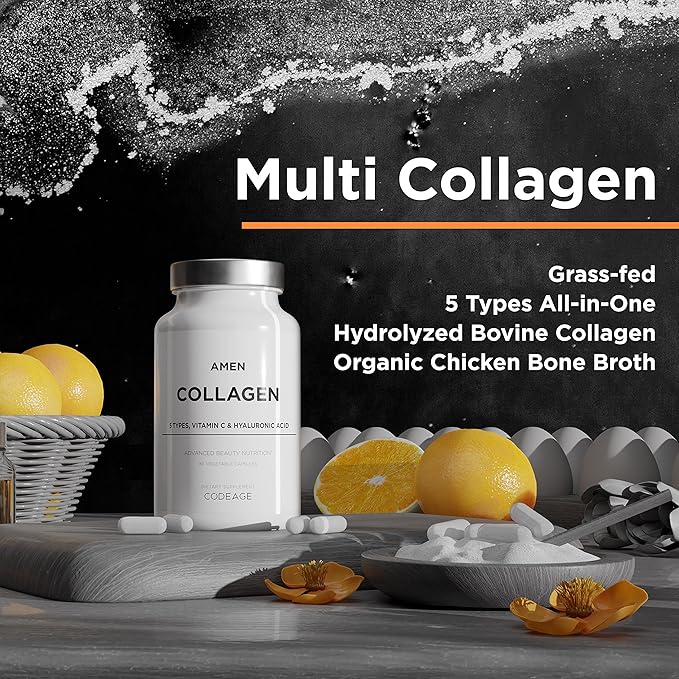 - 5 Types of Collagen: Amen Collagen provides an all-in-one blend of hydrolyzed collagen Types I, II, III, V, and X from grass-fed bovine collagen, free-range chicken, and eggshell membrane collagen peptides.
