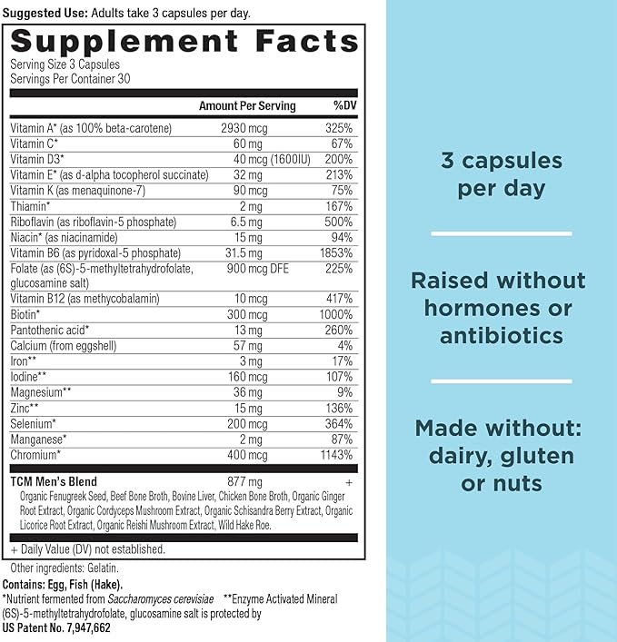 - TCM MEN’S BLEND- Our Traditional Chinese Method blend is based off of a Chinese tradition using herbs that has been around for over 2,000 years.This blend features Organic Fenugreek and Cordyceps mushrooms. We also added Bovine liver and Wild Hake Roe, which are considered some of the most nutrient-dense foods on this planet, as well a collagen-rich bone broth, and ginger as a warming wellness spice.