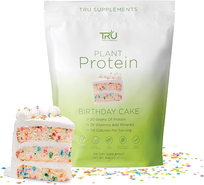 TRU Plant Based Protein Powder, BCAA, EAA, 20g Vegan Protein, 100 Calories, 27 Vitamins, No Artificial Flavors 25 Servings (Birthday Cake)