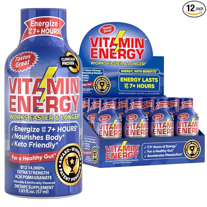 - Powerful energy boost: At only 2 oz per bottle, Vitamin Energy shots are a convenient source of vitamins that boost energy and focus for up to 7+ hours; each low-calorie shot contains 260mg of natural caffeine with zero sugar and zero carbs