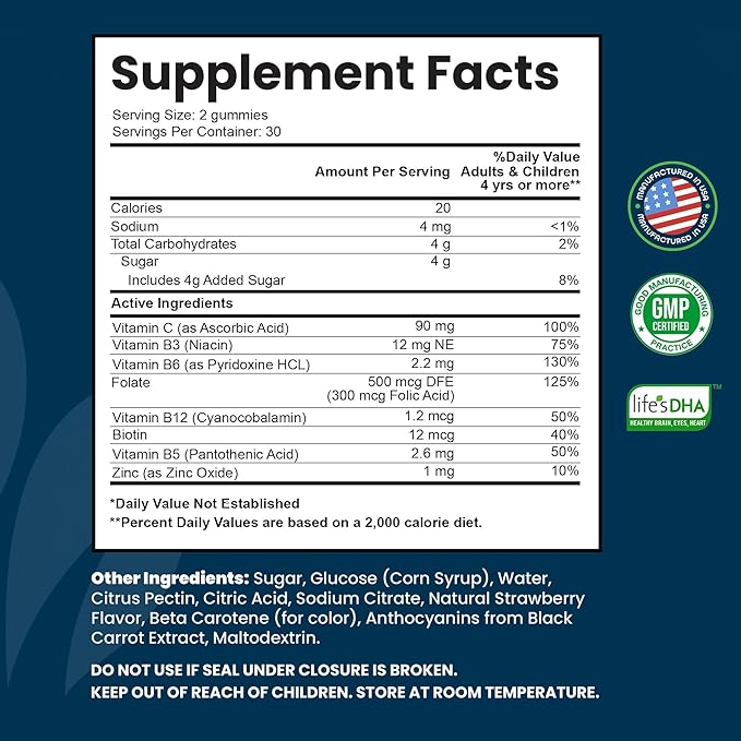 - Enriched with Nine Active Nutrients—Keep your energy high with just two chewable vitamin B gummies per day. Each gummy vitamin B complex contains nine powerful nutrients: vitamin A, vitamin C, folic acid, biotin, zinc, B3, B5, B12,and B6.