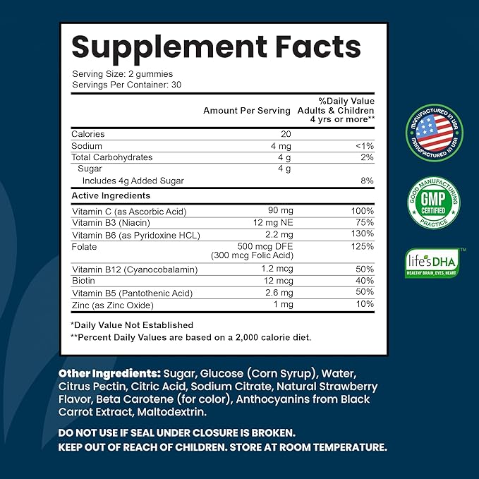 - Enriched with Nine Active Nutrients—Keep your energy high with just two chewable vitamin B gummies per day. Each gummy vitamin B complex contains nine powerful nutrients: vitamin A, vitamin C, folic acid, biotin, zinc, B3, B5, B12,and B6.