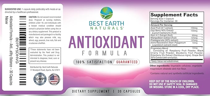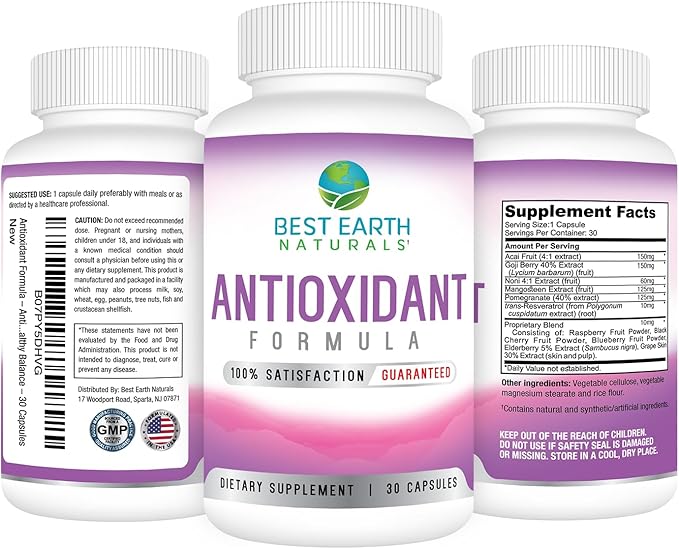 - Antioxidant Blend: Best Earth Naturals Antioxidant Formula is a potent supplement featuring a blend of superfood fruits, including Acai, Pomegranate, Mangosteen, Goji Berry, Noni, and a proprietary fruit extract blend with Elderberry.