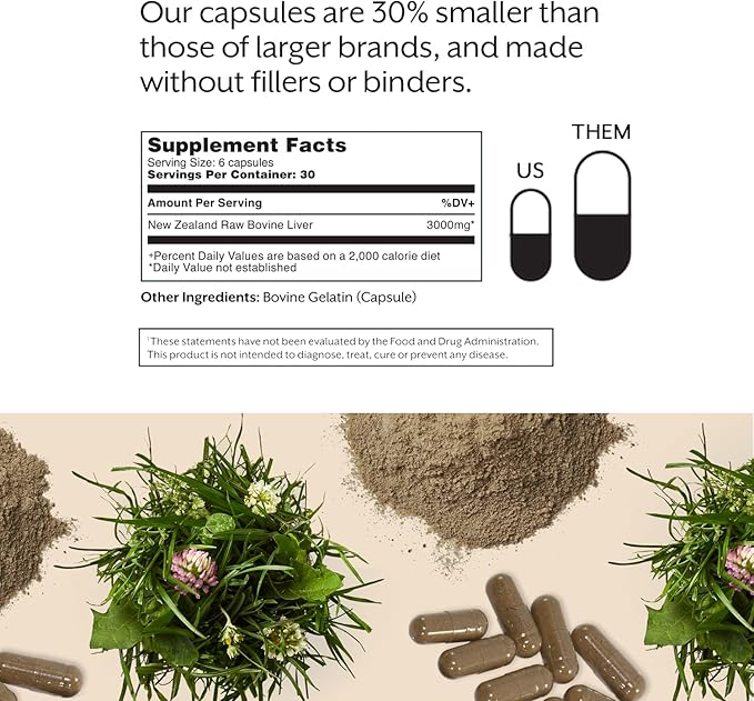 - What’s Inside: A serving of our Liver Supplement is packed with 3,000mg of New Zealand Bovine Liver, a highly bioavailable source of vitamin A, B12, D3, and heme iron.