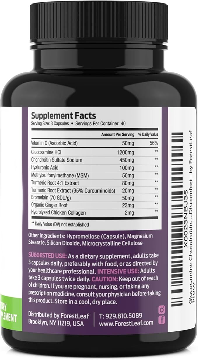 - Powerful joint support blend for active lifestyles - Our advanced formula delivers full-spectrum support featuring Glucosamine HCI (1200mg), Chondroitin Sulfate Sodium (450mg), MSM complex (50mg), Turmeric Root Extract (100mg), Hyaluronic Acid (100mg), Bromelain (50mg), Ginger (23mg) and Vitamin C (50mg), plus 2mg of Hydrolyzed Collagen to help give you total joint and inflammation support to naturally lubricate your joints, increase range of motion and ease joint pain. It helps reduce inflammation, improve flexibility, and promote long-term joint health—great for aging adults, athletes, and anyone on the go