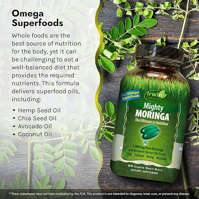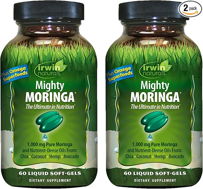 Irwin Naturals Mighty Moringa 1,000 mg - 60 Liquid Softgels, Pack of 2 - with Chia, Coconut, Hemp, Avocado & Omega Superfoods - 60 Total Servings