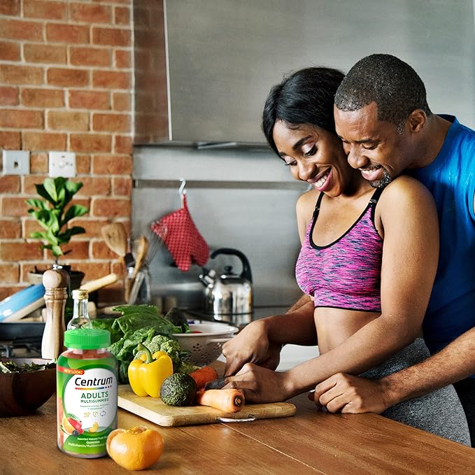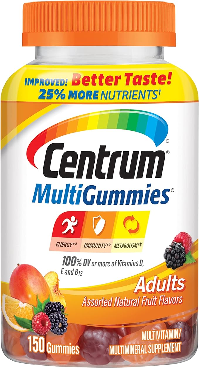 - 150 count bottle of assorted fruit-flavored Centrum MultiGummies Gummy Multivitamin for Adults, Multivitamin/Multimineral Supplement with Vitamins D