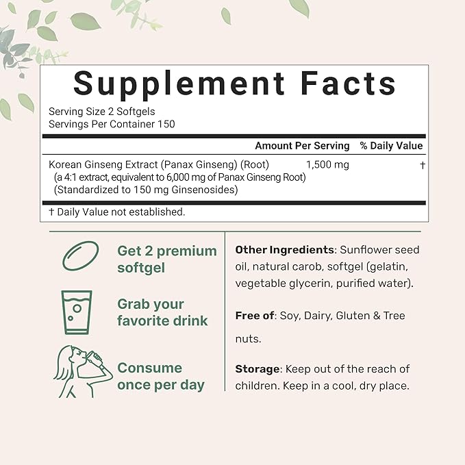 - Each pouch offers 300 max strength softgels that contain the highest quality Korean panax ginseng form. It only takes 2 softgles per serving which equals up to a 150-day supply and allows for a 6,000mg herbal equivalent dose.