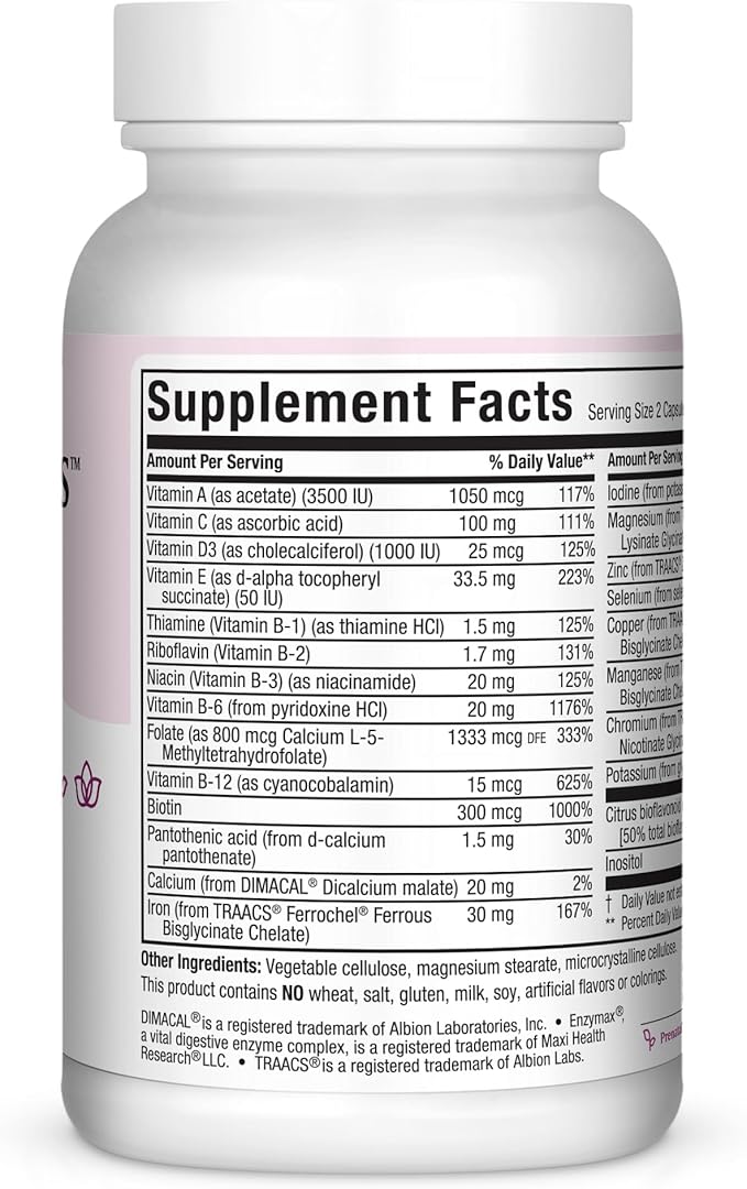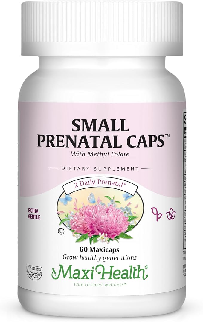 Maxi-Health Small Prenatal Capsules with Methyl Folate - Minerals, Gentle Iron, Vitamins - Kosher, 60 Count