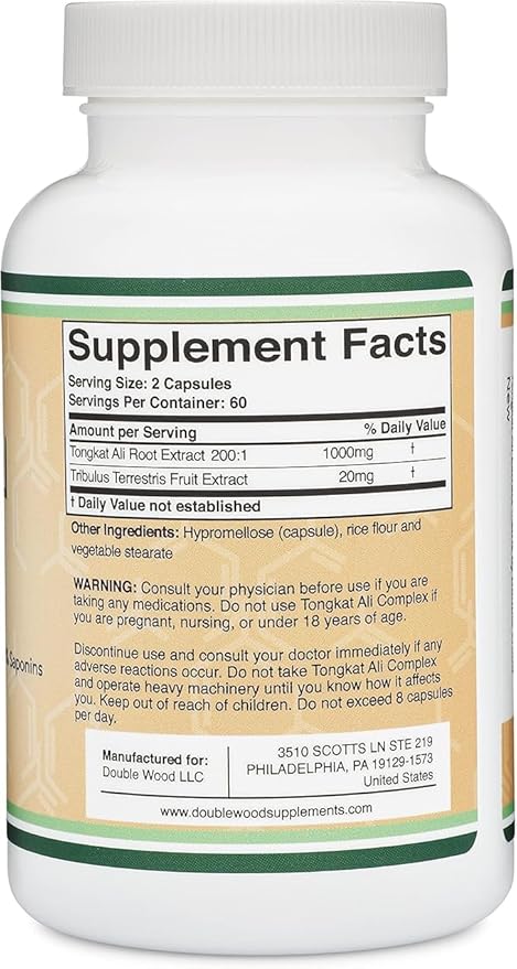 Tongkat Ali Extract 200 to 1 for Men (Longjack) Eurycoma Longifolia, 1020mg per Serving, 120 Capsules - Men's Health Support with 20mg Tribulus Terrestris (Third Party Tested) by Double Wood