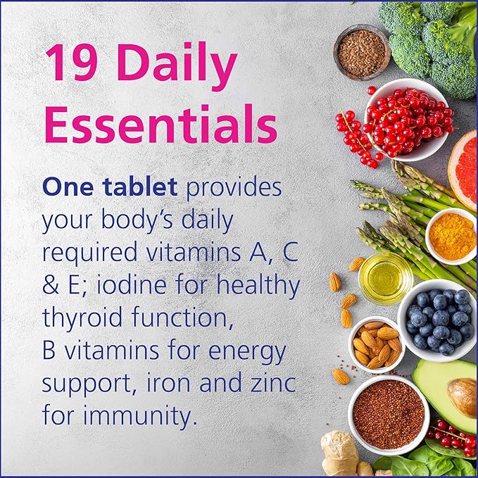 - PACKED WITH 19 ESSENTIAL VITAMINS AND MINERALS - One-a-day multivitamin slowly releases body’s daily required vitamin A, C, E, iodine for healthy thyroid function, B vitamins for energy