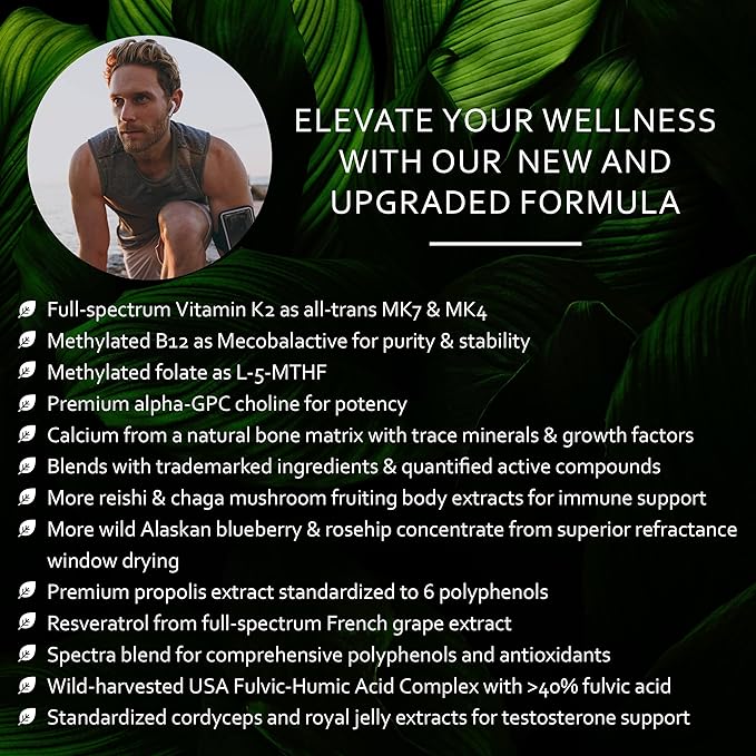 - Whole Food Multivitamin for Men: Our new & upgraded formula offers rapid bioavailability and contains Vit A, C, D3, E, K2, B6, B12, Thiamin, Riboflavin, Niacin, Folate, Biotin, Mg, K, Ca & Zn.