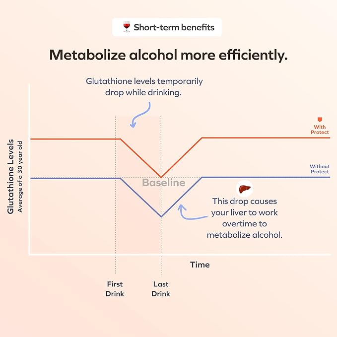 - Master antioxidant: Glutathione is known as the “master antioxidant”, tirelessly working to neutralize toxic substances. For example, consuming alcohol creates oxidation and temporarily drops your glutathione levels, making it more difficult for your liver to process those toxins. Additionally, as you age, your glutathione levels naturally decrease. Taking a daily dose of Cheers Protect will increase your glutathione levels so that your liver can process toxins more effectively.