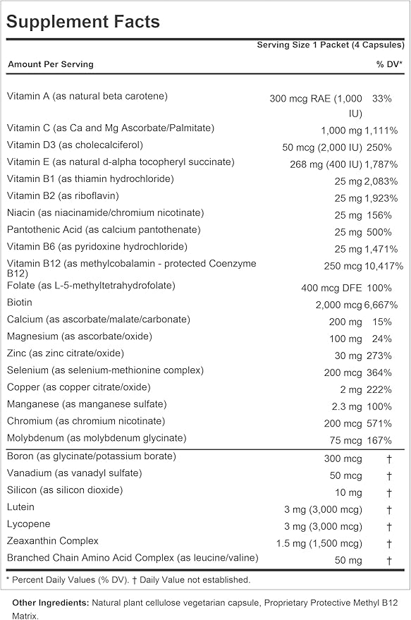 - SUPERIOR 100% PURE BIO-ACTIVE INGREDIENTS – Provides high potencies of all essential vitamins, minerals and carotenoids, including Vitamin A, vitamin C, Vitamin D3, Vitamin E, B-complex vitamins, Calcium, Magnesium, Zinc, Selenium, Copper, Manganese, Chromium, Molybdenum, Boron, Vanadium, Silicon, Lutein, Lycopene, Zeaxanthin and Branched Chain Amino Acid. Contains NO Milk / Dairy-Free, Gluten-Free; NO Additives or Common Allergens of Any Kind.