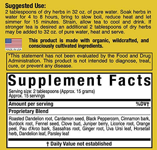 - ✓ USDA Organic Ingredients: Dandelion leaf, Cinnamon, Cardamom, Fennel, Black Peppercorn, Ginger, Burdock, Clove, Juniper berries, Anise, Licorice, Orange peel, Nettle Leaf, Horsetail, Uva Ursi, Parsley leaf; [8oz] SERVING SIZE: 2TBSP /15grams (approx 3 cups prepared); SERVINGS PER CONTAINER: Approx 16. Servings / 48 cups prepared