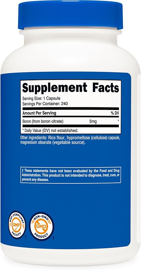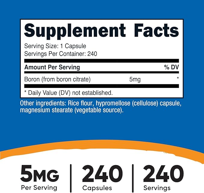 - Nutricost 5mg Boron Capsules contains 240 vegetarian capsules of boron in each bottle for 240 servings.