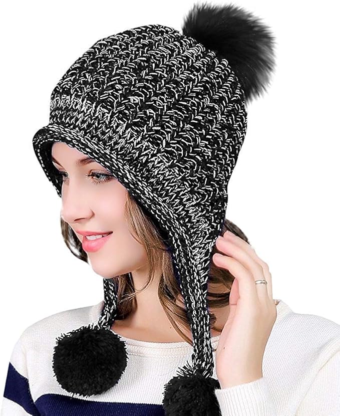 - Feature: Stylish mixed color design with lovely fluffy top pom; Warm fleece fur lined ear cap; Detail ear flaps pom beanie; Looks fashion and cute.