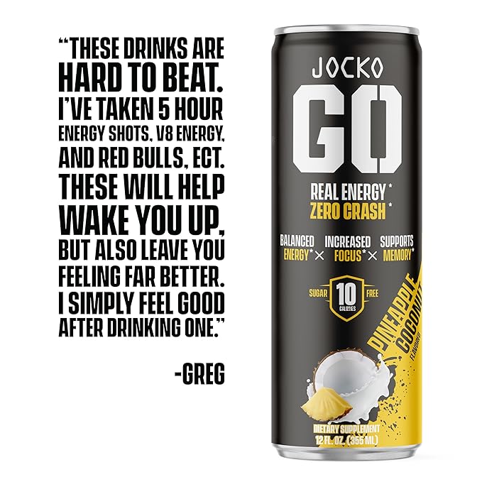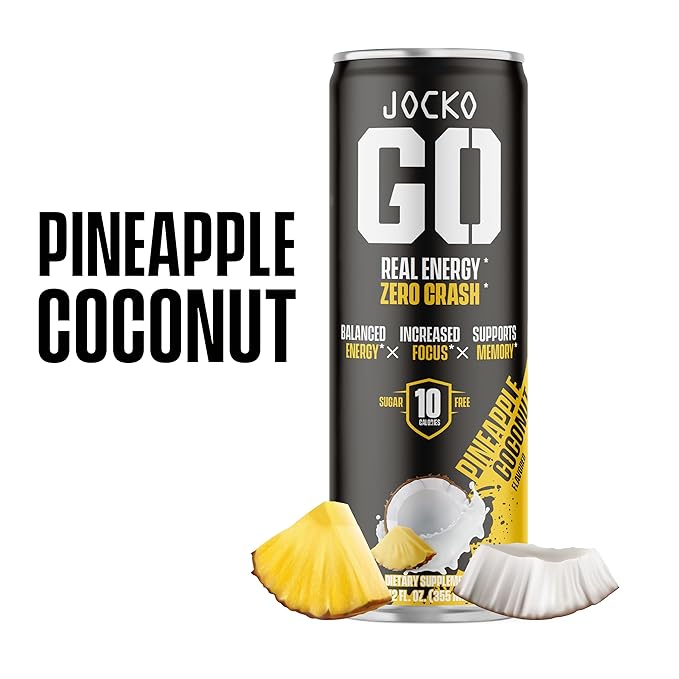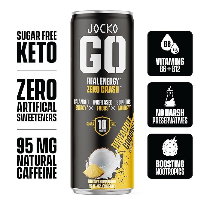 Jocko GO Energy Drink - KETO, Vitamin B12, Vitamin B6, Electrolytes, L Theanine, Magnesium- Energy Boost, Sugar Free Nootropic Monk Fruit Blend - 12 Pack (Pineapple Coconut)