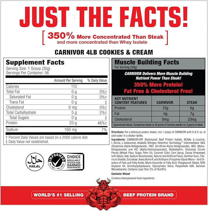 - LACTOSE FREE: Many people are lactose intolerant and have problems digesting whey and other dairy proteins; CARNIVOR contains no lactose so it’s easier on the stomach than whey protein and won’t cause gas or bloating