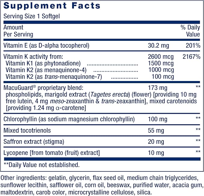 - Primary Supplement Type : Chlorophyllin, MacuGuard® proprietary blend, Vitamin E, Saffron extract (stigma), Vitamin K